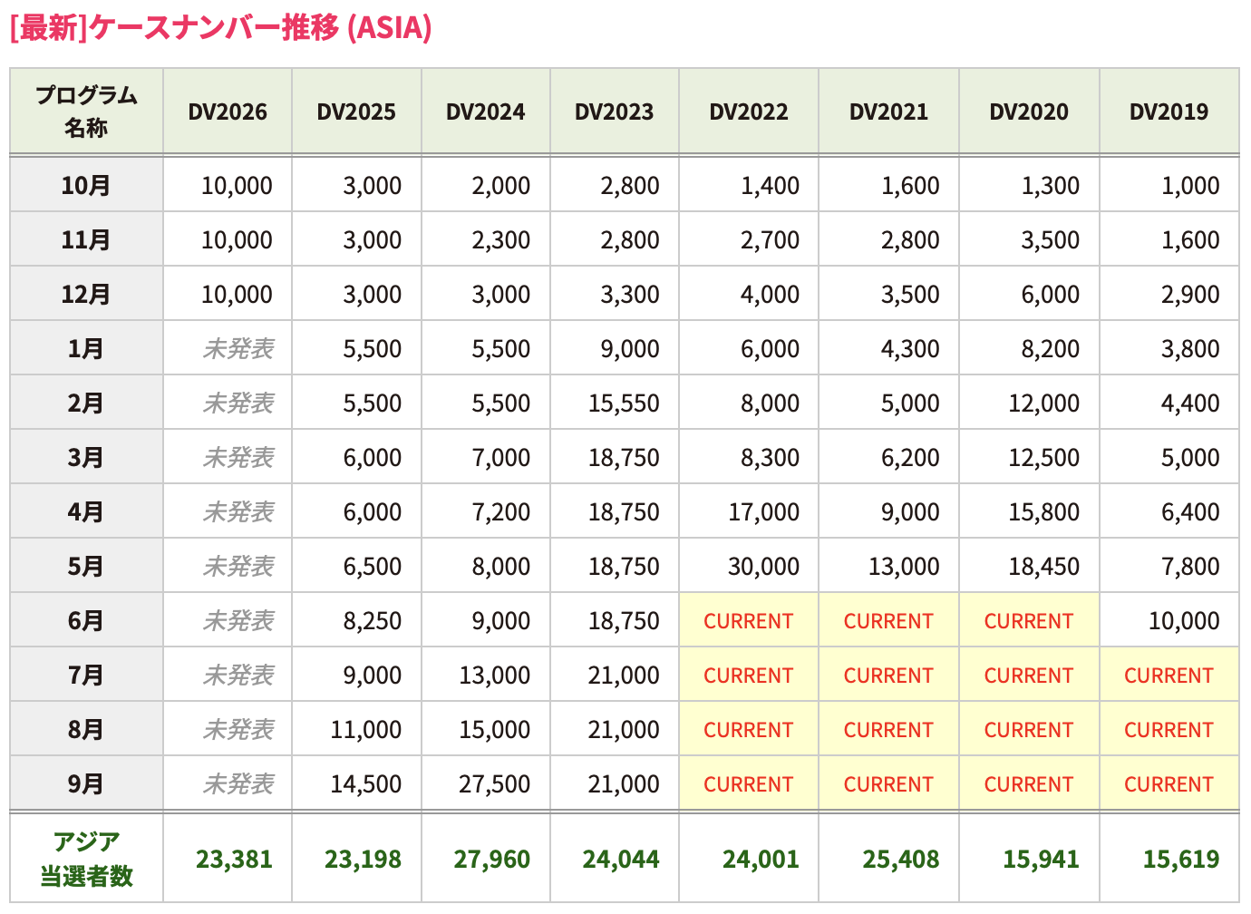 また今回のビザ広報にて、DV2026の当選結果が公開されました。詳細はまた別記事でご案内しますが、アジア地域の合計当選者数は23,381人となり、昨年度とあまり変わらない数字となっています。日本出生者は141人の当選となりました。