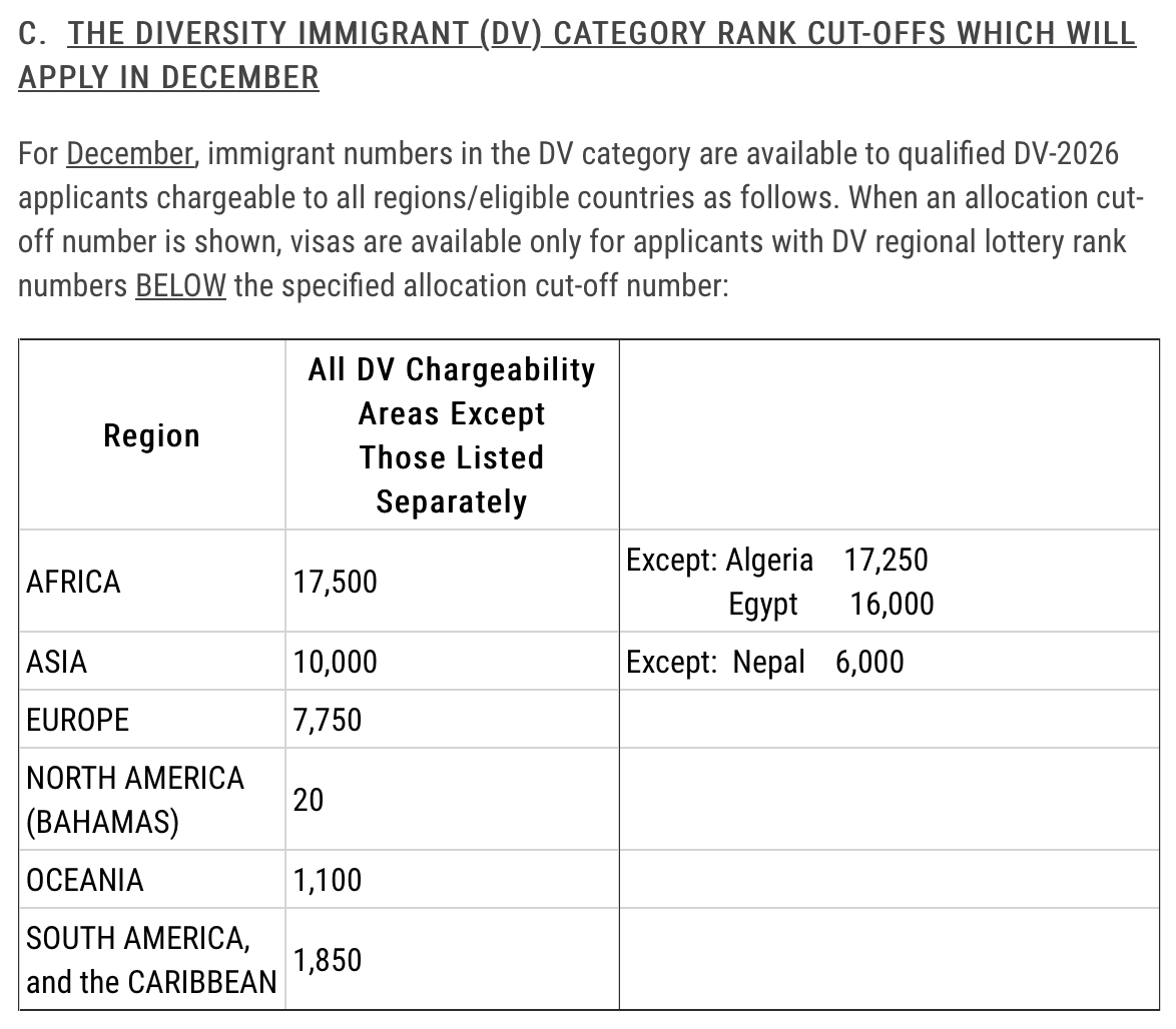 For December, immigrant numbers in the DV category are available to qualified DV-2026 applicants chargeable to all regions/eligible countries as follows. When an allocation cut-off number is shown, visas are available only for applicants with DV regional lottery rank numbers BELOW the specified allocation cut-off number: